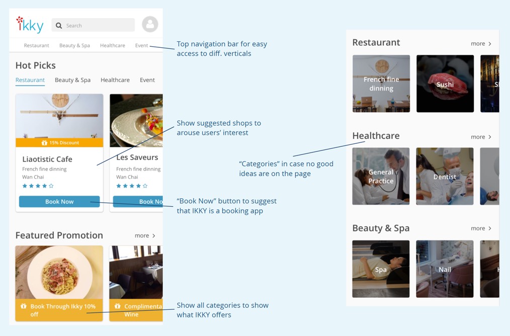 Each prototype was presented to 5 different users for testing. The main idea was to observe how users would find a restaurant for booking. In version 1, none of the users used the search function. While in version 2, 3 out of 5 clicked the search bar to proceed. This demonstrated that minimizing the search function could divert users from jumping to searching to browsing the suggested content.